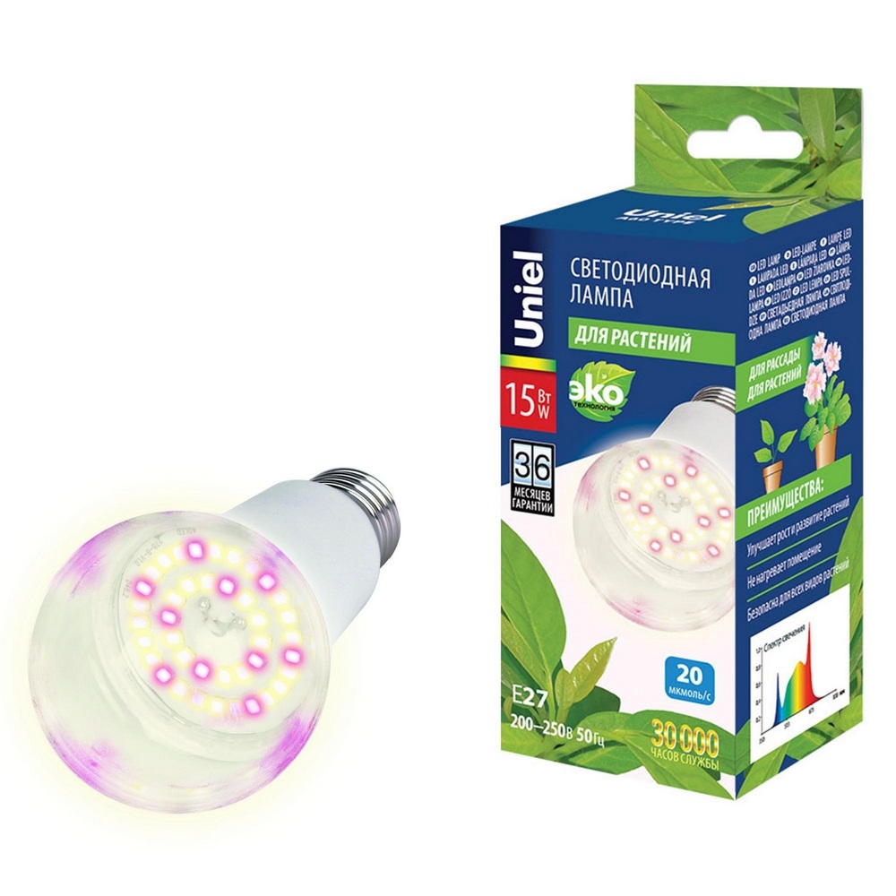 Светодиодная фитолампа для растений LED-A60-15W-SPFB-E27-CL PLP30WH - новинка Uniel, которая успела выйти в лидеры продаж. Благодаря особому спектру свечения значительно ускоряет рост растений, от семян до плода. Энергоэффективность А++. Срок службы до 30000 часов. Срок годности фитолампы не ограничен. Оптимальная световая температура: близка к дневному свету и не напрягает глаза. Почти не нагревается, что дает возможность использовать фитолампу на пожароопасных объектах. Возможность использования от -20 до +40 градусах Цельсия. Мощность лампы 15 Вт. Стандартный цоколь Е27. Габариты картонной упаковки: Д/Ш/В 13,3/6,1/6,1 см. Гарантия от производителя 36 мес. Скидки до 28% при единовременной оптовой покупке и накопительная система скидок.