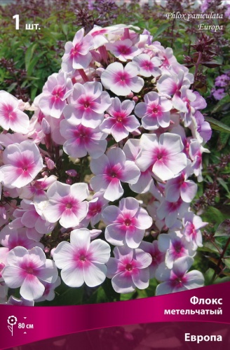 Европа - высота растения 80 см. Куст прочный, стройный, гармоничный. Соцветие округло-коническое, большое, плотное, красиво сложенное. Цветок колесовидный, белый с карминовым колечком, диаметр цветка 3,5 см. Неприхотливый сорт. Быстро разрастается и размножается.