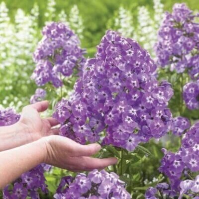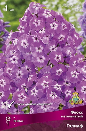 Голиаф - высота растения 70-80 см. Цветок сиреневый с белым глазком. Соцветия крупные, плотные. Срок цветения поздний.
