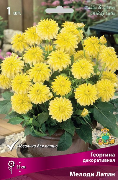 Мелоди Латин - высота растения 55 см. Цветок диаметром 10 см, ярко-желтый, цветет до заморозков. Сорт идеален для патио.