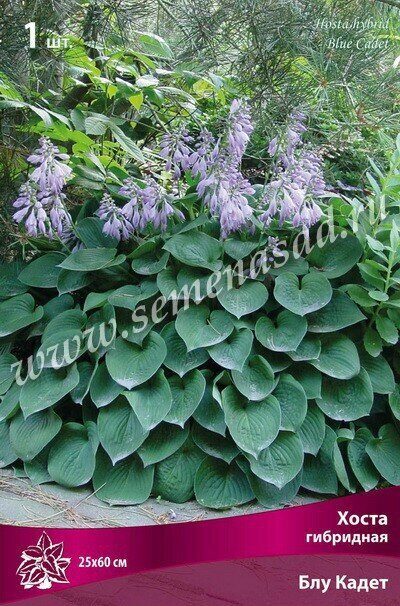 Блу Кадет - высота куста 25 см, ширина до 60 см, листья сердцевидные, плотные, зеленовато-голубые, цветки лиловые. Цветение июль-август.