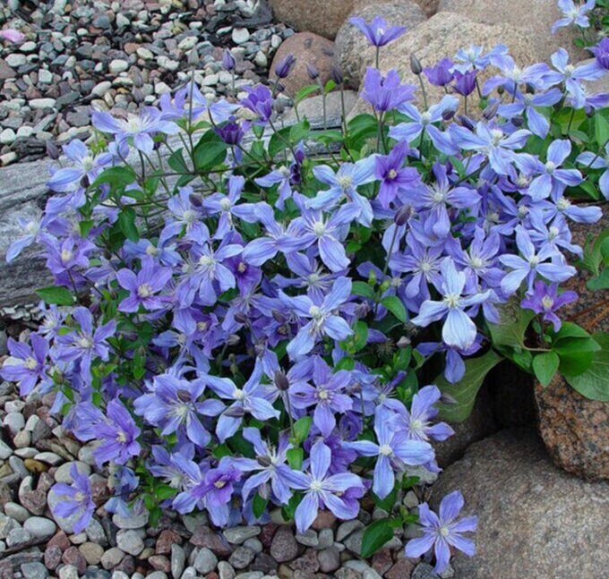 Прекрасное растение – все лето обсыпано массой цветов, меняющих окраску с фиолетовой на голубую, с белыми тычинками. Высота 1,5-2 м. Побеги приподнятые, не цепляющиеся за опоры. Может стелиться по земле. Красиво переплетается с другими растениями. Устойчив и неприхотлив.