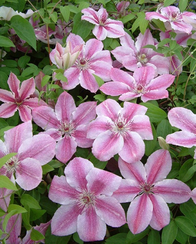 Цветки диаметром 10-12 см, розового цвета с темно-розовой полоской. Цветет с мая по август. Лиана высотой 2 м, подходит для контейнерного выращивания. На зиму в средней полосе требуется обязательное укрытие. Обрезка слабая (II группа).