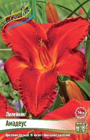 Травянистое растение с цветками, достигающими 14 см. в диаметре. По форме напоминает лилию. Цветок алого окраса с желто-зеленым горлом. Лилейник Амадеус (Amadeus) формирует от 2 до 3 цветков одновременно. Срок цветения составляет 25 дней и более, цветет непрерывно. Этот сорт неприхотлив в уходе.