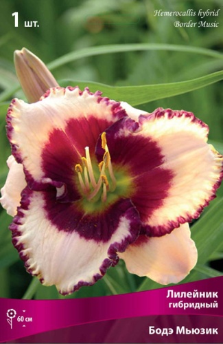 Бодэ Мьюзик - высота растения 60 см, цветок кремовый с темно-сливовым пятном и выразительной каймой, горло зеленое, крупный, гофрированный, повторное цветение.