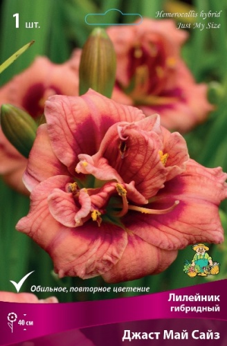 Джаст Май Сайз - высота растения 40 см. Цветок махровый, розово-лососевый с красным горлом, на 3-й год число цветков на одном растении за сезон достигает 400 шт, диаметр цветка 8 см, повторное цветение.