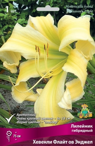 Хевенли Флайт ов Энджел – высота растения 75 см, цветок-спайдер, желтый с белой каймой и большим зеленым горлом. Цветение июль-август.