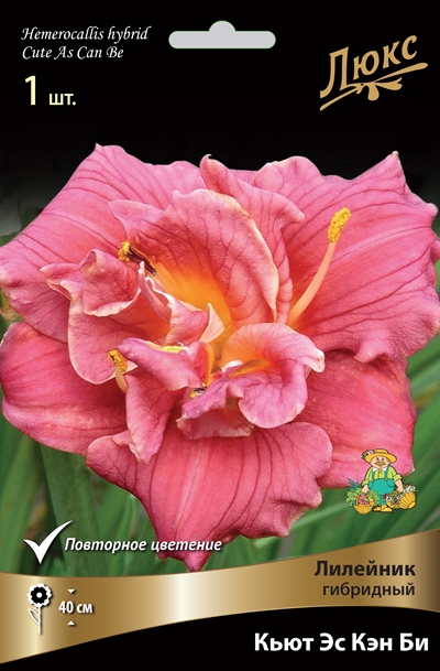 Кьют эс кэн би – высота растения 40 см. Цветок насыщенно-розовый с желтым глазком, махровый, повторное цветение.