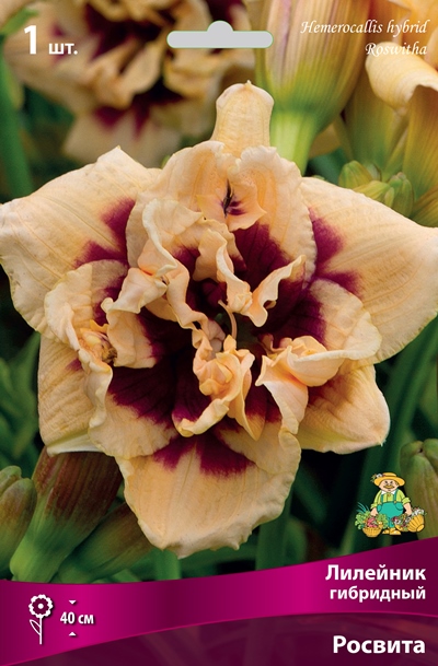 Росвита - высота растения 40 см. Цветок махровый кремово-персиковый с винно-красным центром.