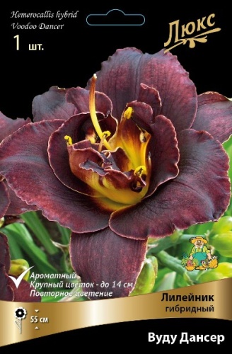 Вуду Дансер - высота растения 55 см. Цветок темно-фиолетовый с зеленым горлом, махровый, ароматный, диаметр цветка 14 см, повторное цветение.