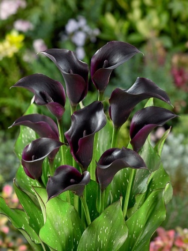 Уход: обильные поливы весной и летом, особенно в жаркие дни, осенью каллам хватает естественной влаги. Подкормки производят 1 раз в 2 недели минеральными и органическими удобрениями. В открытом грунте каллы не зимуют. Клубни выкапывают вместе с надземной частью в середине-конце сентября до того, как установятся отрицательные температуры. В таком виде оставляют на просушку в течение 1-2 недель. Когда листья будут легко отделяться от клубнекорня, подсушивание можно прекращать. Очищенные от надземной части, клубни калл перекладывают в бумажные пакеты и хранят в сухом месте при температуре +5…+15 0С до следующей посадки.