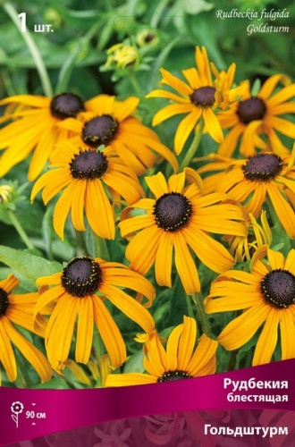 Гольдштурм - высота растения 90 см, цветок желтый с темно-коричневой серединой.