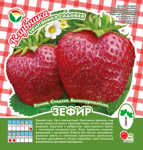 Клубника Зефир является очень ранним сортом, отличается крупными ягодами. Опушённые листья растут на компактных кустах, высота которых достигает 40-60 сантиметров. Слегка гофрированные тёмно-зеленые листовые пластины располагаются на прямостоячих стеблях длиной до 10 сантиметров. Цветоносы направляются вверх, каждый из них несёт приблизительно 15-20 бутонов. Цветоносы прочные, не гнутся под весом ягод к земле.
