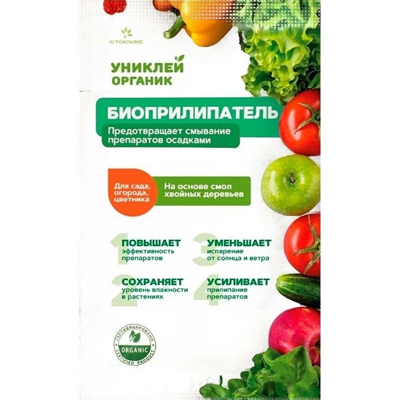 Биоприлипатель «Униклей Органик» (биоклей) - используется для повышения эффективности обработок защитными и питательными препаратами на овощных и плодово-ягодных культурах, декоративных растениях, для лучшего прилипания средств защиты растений, сохранения влаги, уменьшения испарения, способствует сохранению урожая.