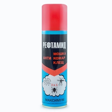 Рефтамид Максимум средство репеллентное (отпугивающее) для защиты людей от нападения кровососущих насекомых (мошек, комаров мокрецов, москитов, слепней, москитов, слепней, блох) лесных и таежных клещей. При нанесении на открытые части тела, одежду, занавески, сетки и другие изделия из ткани.
