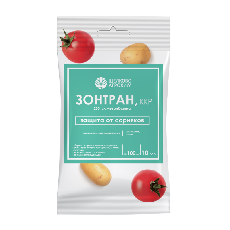 Средство от сорняков «Зонтран, ККР» – контактный гербицид для уничтожения широкого спектра двудольных и злаковых сорняков на посевах картофеля и томатов. Уничтожает более 50 видов сорняков и образует защитный экран, не смываемый дождем. Препарат поглощается листьями и корневой системой прорастающих сорняков, угнетает чувствительные сорняки. Видимые симптомы воздействия на сорняки — через 2–7 дней, гибель сорняков – через 10-15 дней после опрыскивания. Обеспечивает чистоту посадок от чувствительных сорняков на один месяц.