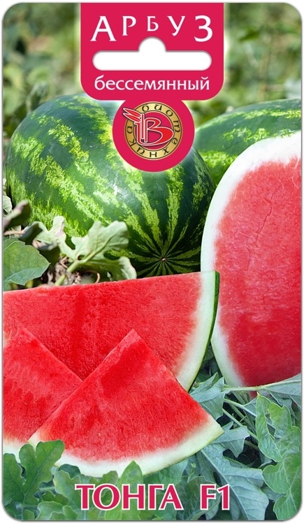 Гибрид среднеранний, от посева до первого сбора плодов 85-90 дней. Растения мощные, хорошо облиственные. Плоды овальные, с классической полосатой окраской. Мякоть ярко-красная, хрустящая. Вкусовые качества высокие, сахаристость 12% по шкале Брикса. Благодаря отсутствию семян, очень удобен при потреблении.